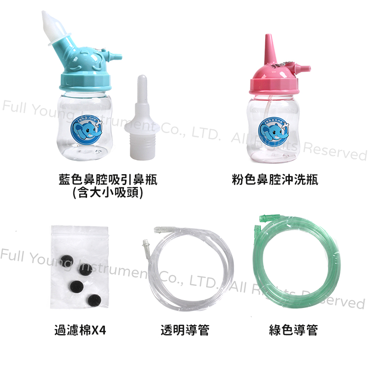 產品內附:主機一台、說明書一本、藍色鼻腔吸引鼻瓶(含大小矽膠頭)x1、粉色鼻腔沖洗瓶x1、過濾棉x4、綠色導管x1、透明導管x1