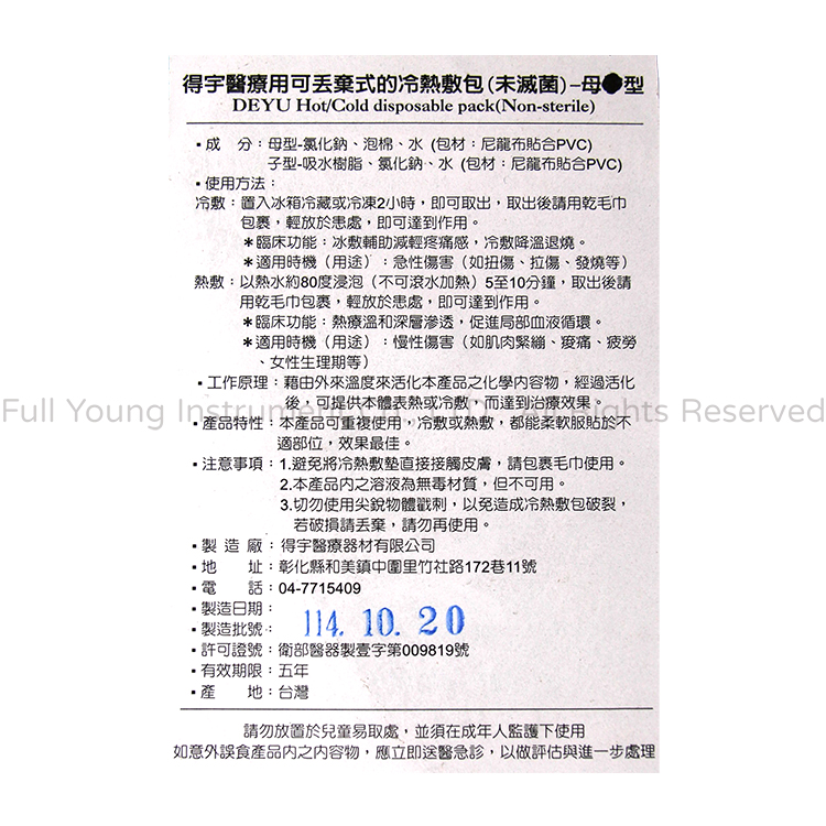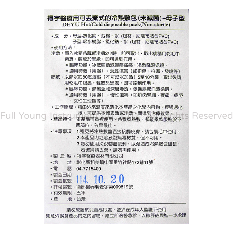 醫療器材許可證所載品名:"得宇" 醫療用可丟棄式的冷熱敷包(未滅菌)