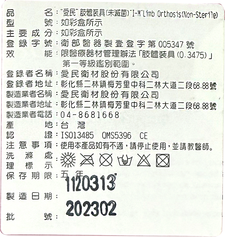 醫療器材許可證所載品名:“愛民” 肢體裝具 (未滅菌)